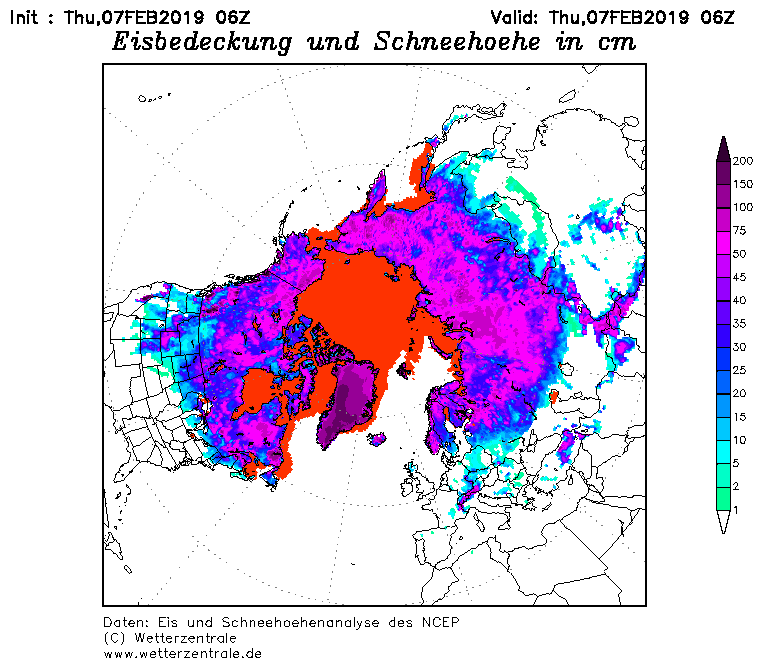 January 31 to February 8 JAXA sea ice measurements reveal only 2018 being lesser in extent by about 16 thousand kilometers square on the 8th. This is an extraordinary feature of winter 2019 with a distinctively dissimilar general circulation than the preceding 6 seasons....... 2019's general circulation to date can be characterized in part by by a snow footprint: