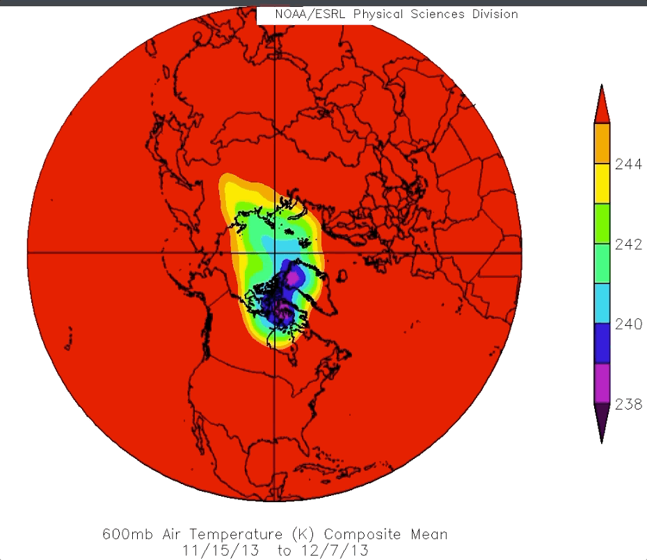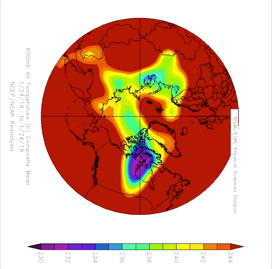 NOAA daily composites 600 mb temperatures (close to the density weighted temperature of the entire troposphere), Arctic Polar Vortex average location January 4 to February 4 2019. Siberia dominates, which is contrary to all winters going back to 2012. There are some similarities from season to season, but very prominent differences were distinguishable by analyzing maps daily, overall PV average extent calculations may appear somewhat similar, but they are not: