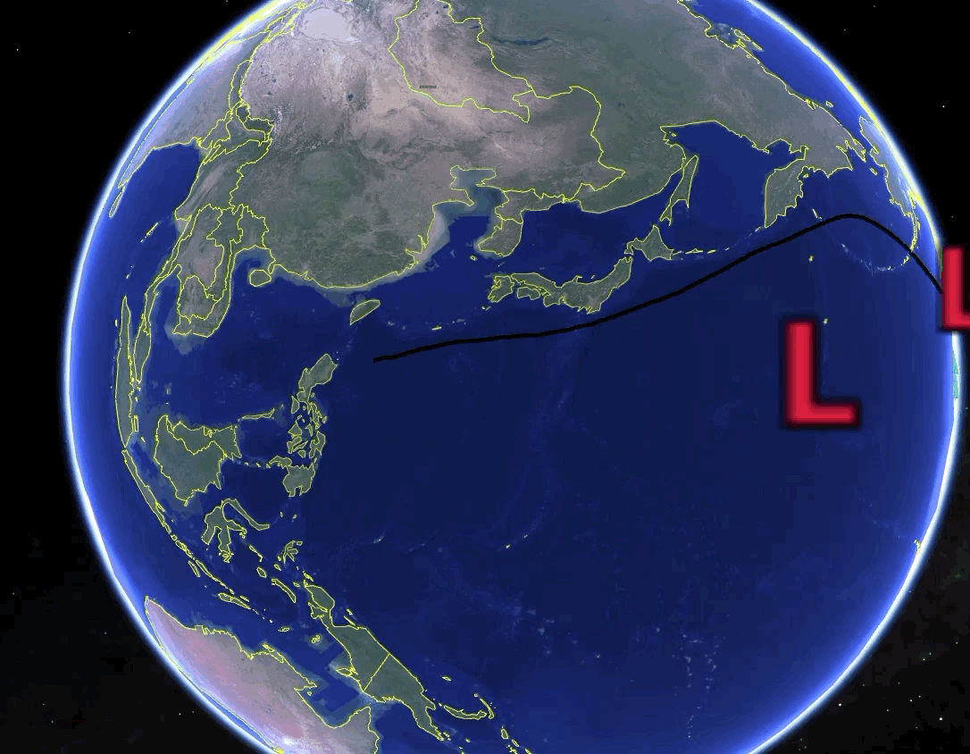 The implied late autumn black line should be the location of the polar jet stream given the latest sea ice extent losses. Fortunately often present massive North Pacific cyclones bend the jet to its South (red line), but this means the North Pacific is covered with clouds for vaster periods, not cooling the sea surface to space. This also implies a shift in rainy season of the West North American coast, well Northwards, this current climate scene was not always so :