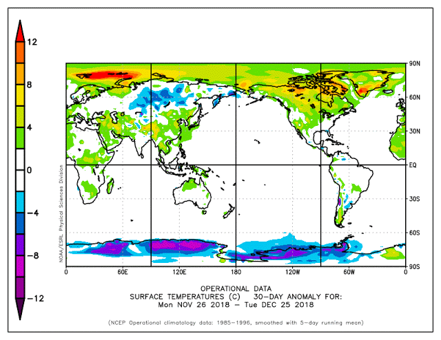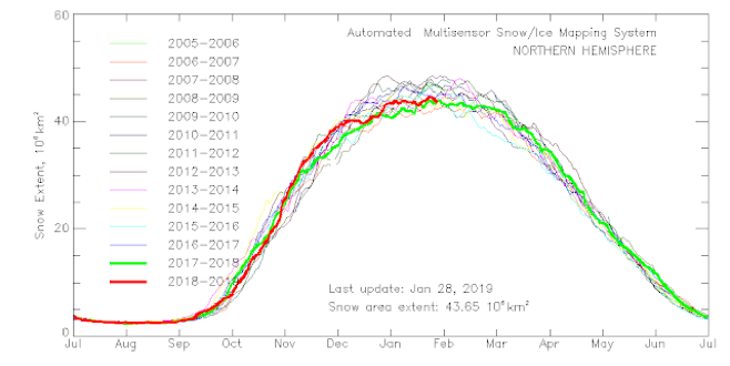 Here is the biggest indice: December 2018 was warm, very warm, with the Cold Temperature North Pole in Northern Russia. Warmer in winter can only mean less snow on the ground especially in the great continental interior lands.