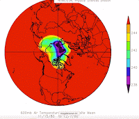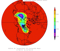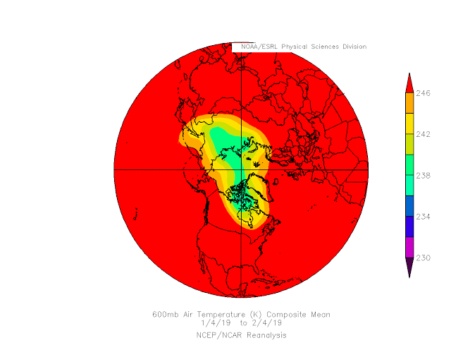 NOAA daily composites 600 mb temperatures (close to the density weighted temperature of the entire troposphere), Arctic Polar Vortex average location January 4 to February 4 2019. Siberia dominates, which is contrary to all winters going back to 2012. There are some similarities from season to season, but very prominent differences were distinguishable by analyzing maps daily, overall PV average extent calculations may appear somewhat similar, but they are not: