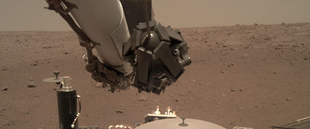 NASA InSight December 5 and 7 2018 . 15:27 and at 11:34 local mean solar time respectively, the 5th has greater shadow to the right. The robotic arm has likely moved around, and is placed back not always exactly in this same resting spot. The pictures are aligned, with your mouse pointer, verify carefully the positions of nearest rocks, now look at the horizon. Point your mouse at any point on the horizon line, you will see the darker image having a very slightly higher horizon throughout. The darker image is nearest local noon, with warmest sun effects, was likely taken with an optical filter. If there is near surface permafrost the horizon should eventually lower, in this case the horizon lowered perhaps further and is now rising towards the near noon height, meaning the ground horizon has sea ice properties, namely frozen water....