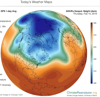University of Maine current day weather, February 14 2019. 500 mb Geopotential levels, pressure heights, is not the best pressure level to express the Polar Vortex. 600 mb is, in this standard map, pressure heights confuse where the coldest air lies, but for sake of this presentation, observe and use your mouse pointer at the limits of lower heights (with mostly colder temperatures) match with the location of the jet stream. The jet stream is a creature which lives at the outside perimeter of coldest air and southern limits of intense cyclones. Therefore by simple projections, jet stream meanders happen when the coldest atmosphere has a much smaller area: