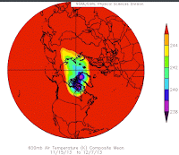 Not having any other charts available, University of Maine 500 mb pressure heights clearly depict potentially the coldest vortice within the Polar Vortex. Clearly not in the Arctic.