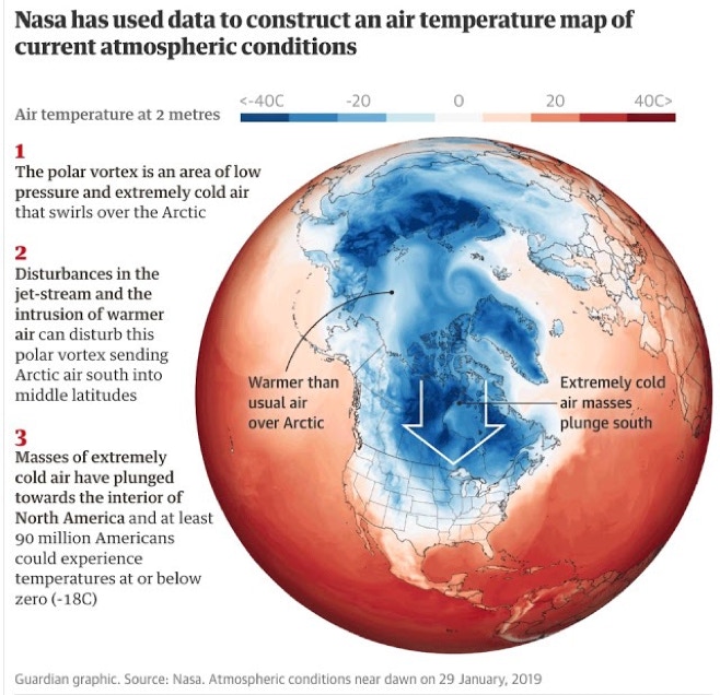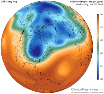 Rogue vortices spin away from the Polar Vortex especially when the Vortex is stretched thin, which is also what is happening. The essential look of 2019 is a much warmer Alaska continuously warmed by the Pacific sst Blob cyclones, which turned the jet stream strait towards Chicago, only now we have a gathering of much colder air which took a month or so to gain extent and to permeate heavily populated areas. WD January 28 2019