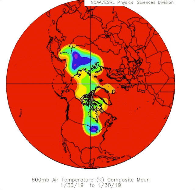Temperatures at 600 mb NOAA daily composites,( map largely in red) at about -30 C is where the jet stream is formed. look at Japan's intense jet and how cold 600 mb was at that location. There are also cyclonic peripheral adjuncts which extend the coldest atmosphere/jet border line by pressure dropping the thickness of pressure heights. Basically January 30 had a stretched out coldest atmosphere. The jet stream morphed around the coldest air, and did not exactly drag Arctic Air southwards. Equally, colder temperatures in winter can be created over continents well away from the Arctic, and depend on basic geophysics such as snow cover with little or none and clear or covered skies under very little insolation ...... WD February 14 2019