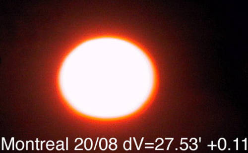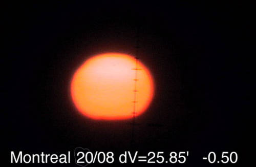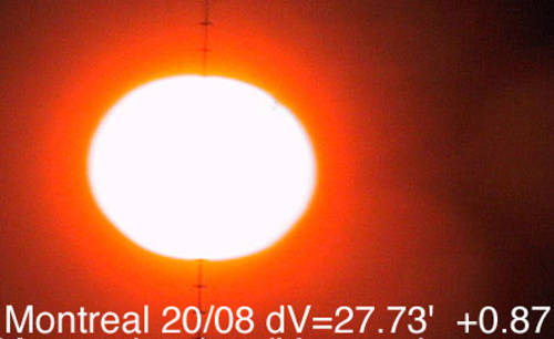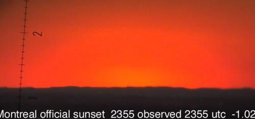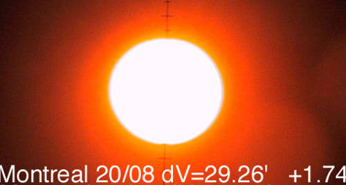 0.8 degrees. Warm to cold comparison is rich with contrasts, Montreal had no green nor red flashes (center) while Resolute had a prominent red flash below, the flash was so thick that it affected its differential refraction reading. Montreal was rounder while Resolute (in April) would have been more flatter was it not for the extra red mirage. |