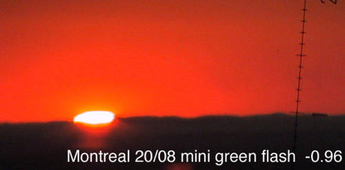 -0.9 degrees (astronomical elevation at the sun center). Sunrisesunset.com, a good sunset calculator from the internet, calculated this sunset perfectly for warm air, while in the North the same program utterly failed on every occasion in very cold air. The difference in sunset elevations between August 18 and 20 in Montreal was caused by a somewhat colder air mass coming from the West. The sunset on the 20th occurred a few hundred of degree lower than on the 18th. The cold April 15 example is a complete yet compressed sun with round top and almost flat bottom with a small elongated red flash. The center picture had a minuscule green flash on top of the upper limb, this flash lasted for a very brief period of time, while up North Green flashes last up to 10 seconds or more. |