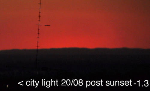 -1 degrees. While the sun disk has completely disappeared from the horizon in warm air, cold air boosted the sun disk very well above. No filters were used on all three pictures having the same camera setting, show a great difference in sky colours. As far as I know, there are no examples of Temperate or Tropical sunset sightings below this elevation without the presence of some cold air. |