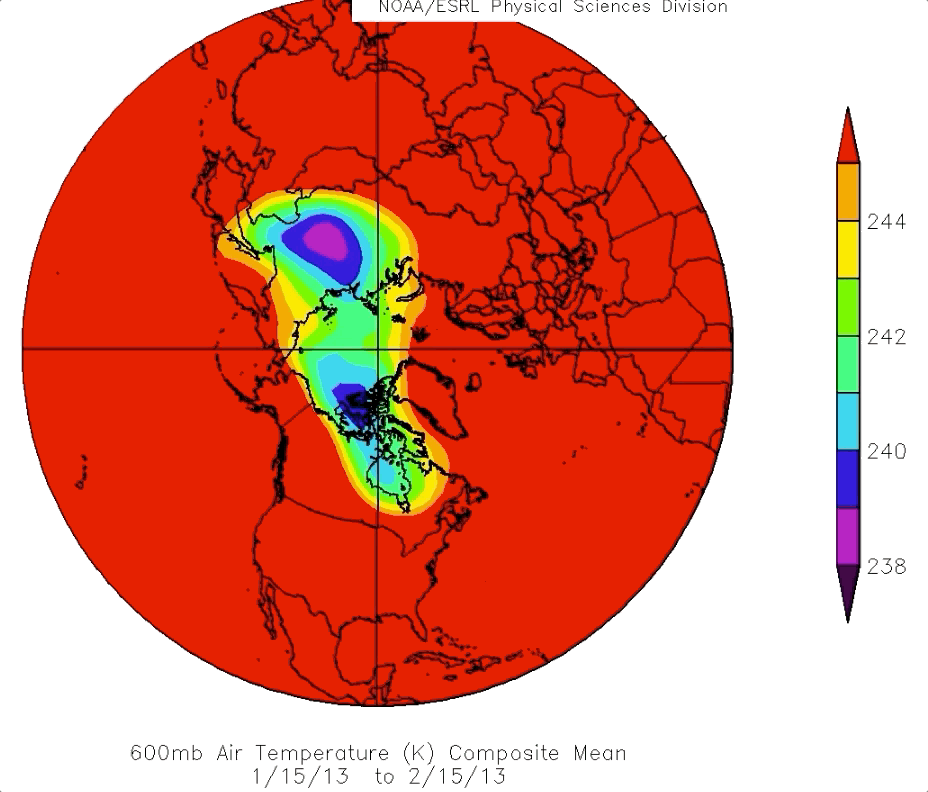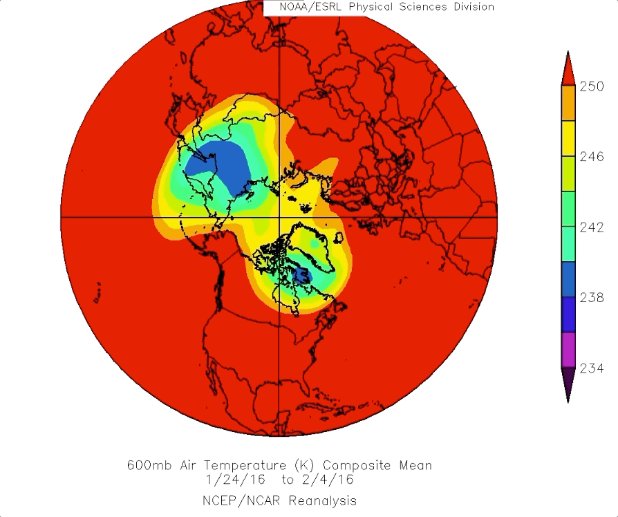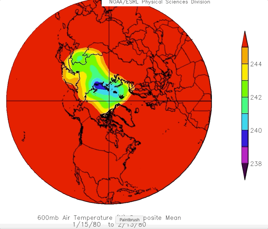 NOAA daily composites 600 mb temperatures (close to the density weighted temperature of the entire troposphere), Arctic Polar Vortex average location January 4 to February 4 2019. Siberia dominates, which is contrary to all winters going back to 2012. There are some similarities from season to season, but very prominent differences were distinguishable by analyzing maps daily, overall PV average extent calculations may appear somewhat similar, but they are not: