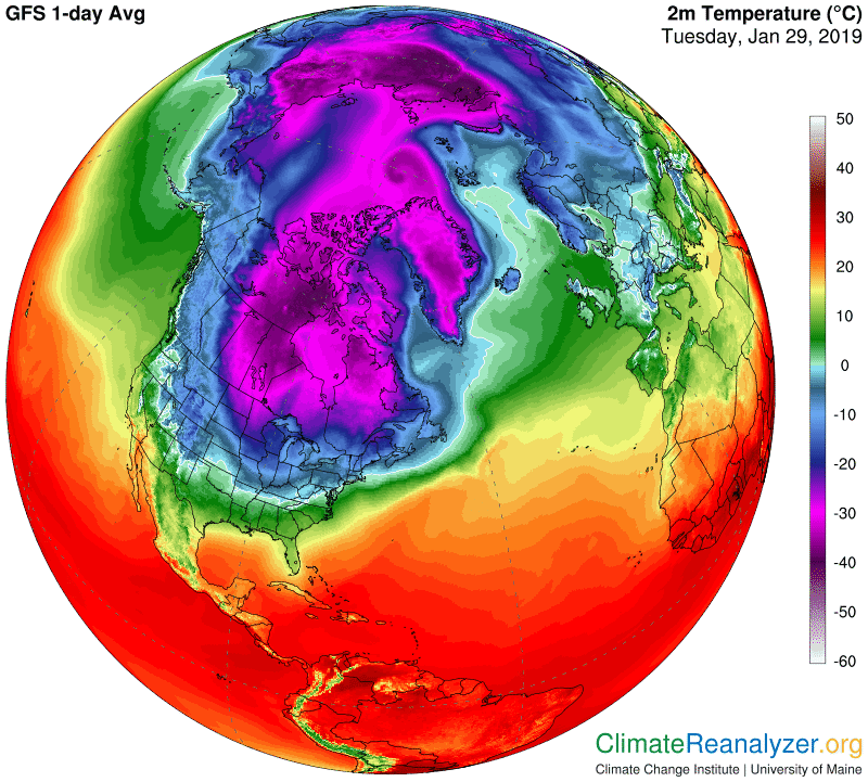The frequent misnomer used by weather medias naming and blaming "Arctic Air" is not quite always accurate, in this case the colder air vortice built itself well South of the Arctic, which means, a thinner continental snow cover canopy twinned with clear air with low sun elevation at noon , along with longer dark nights than daylight can create colder than Arctic temperatures in the South of it. A rapid Plains USA fluctuation in temperatures is soon to follow , with upcoming much warmer temperatures in a few days, is merely a representation on how thinly spread out the cold air areas are, or not really re-enforced by the Arctic, but rather a fleeting happenstance generated by a steady in origin large Anticyclone. WD January 30, 2019